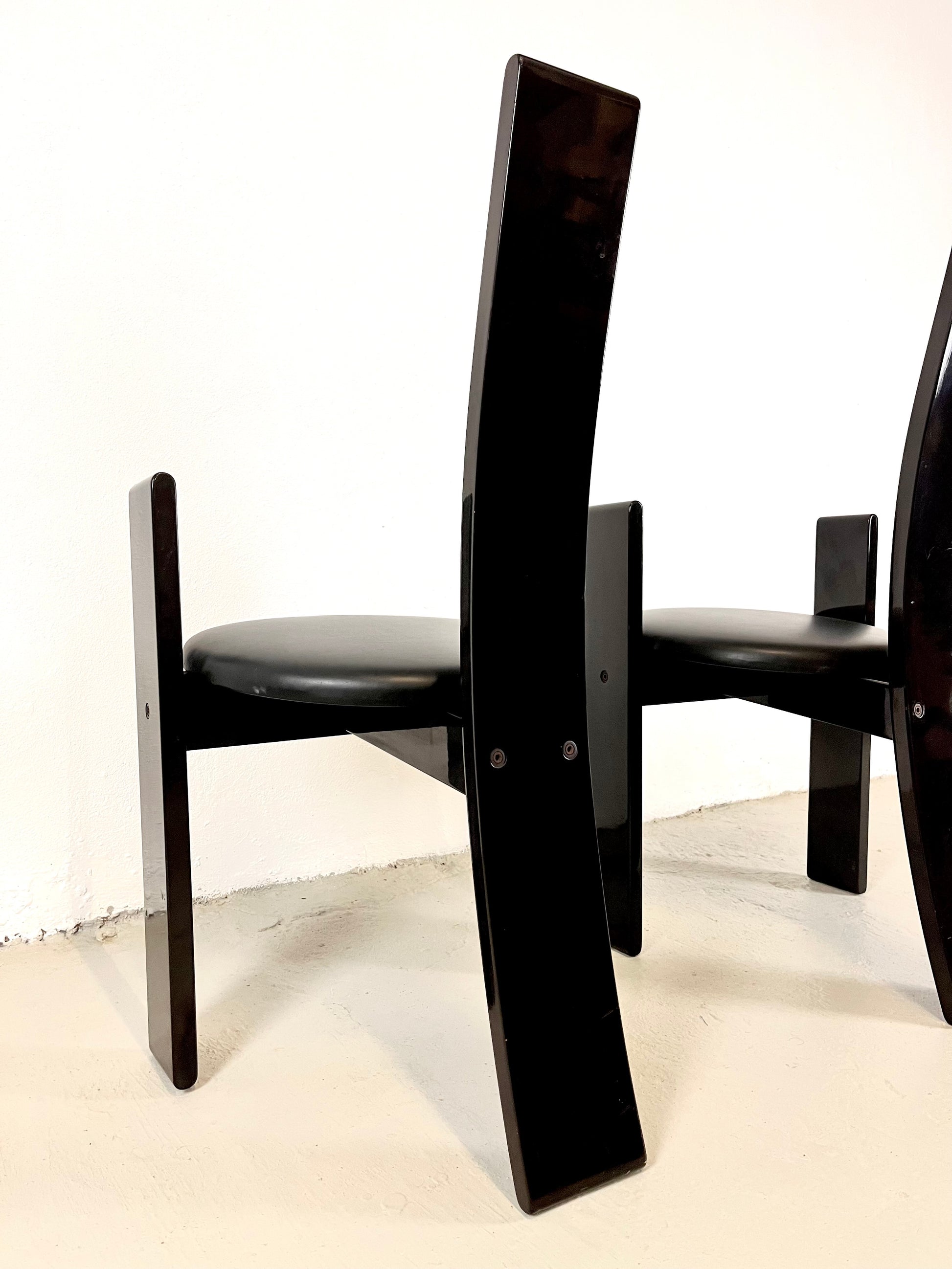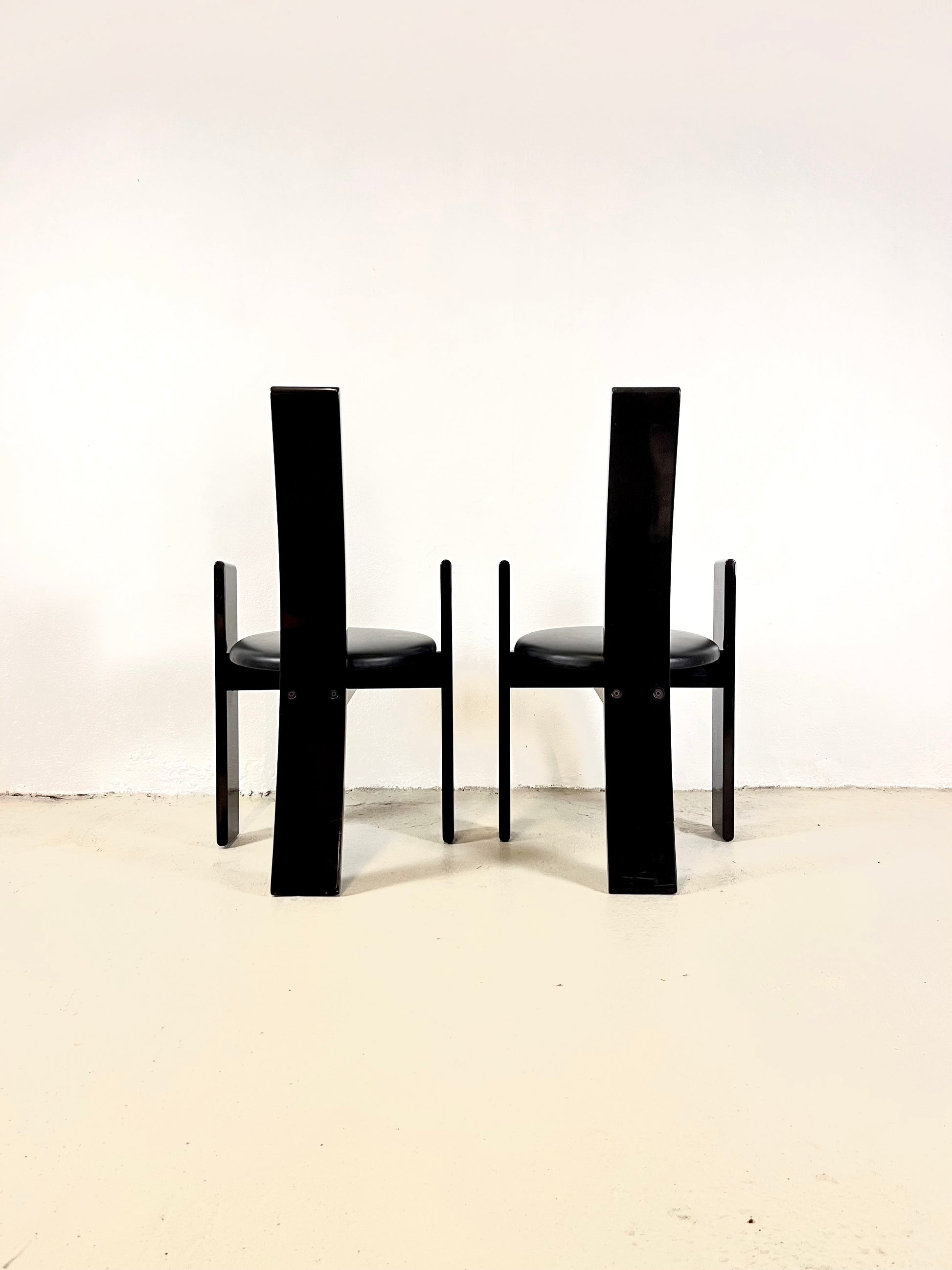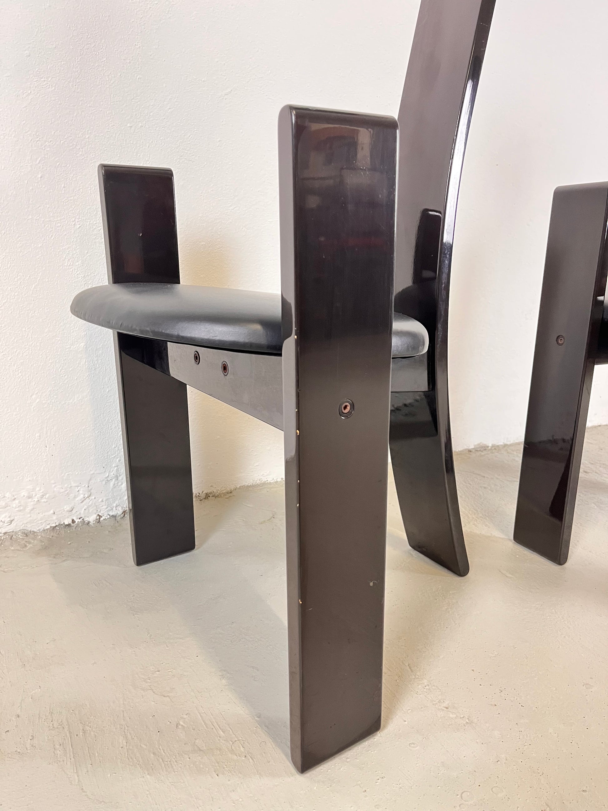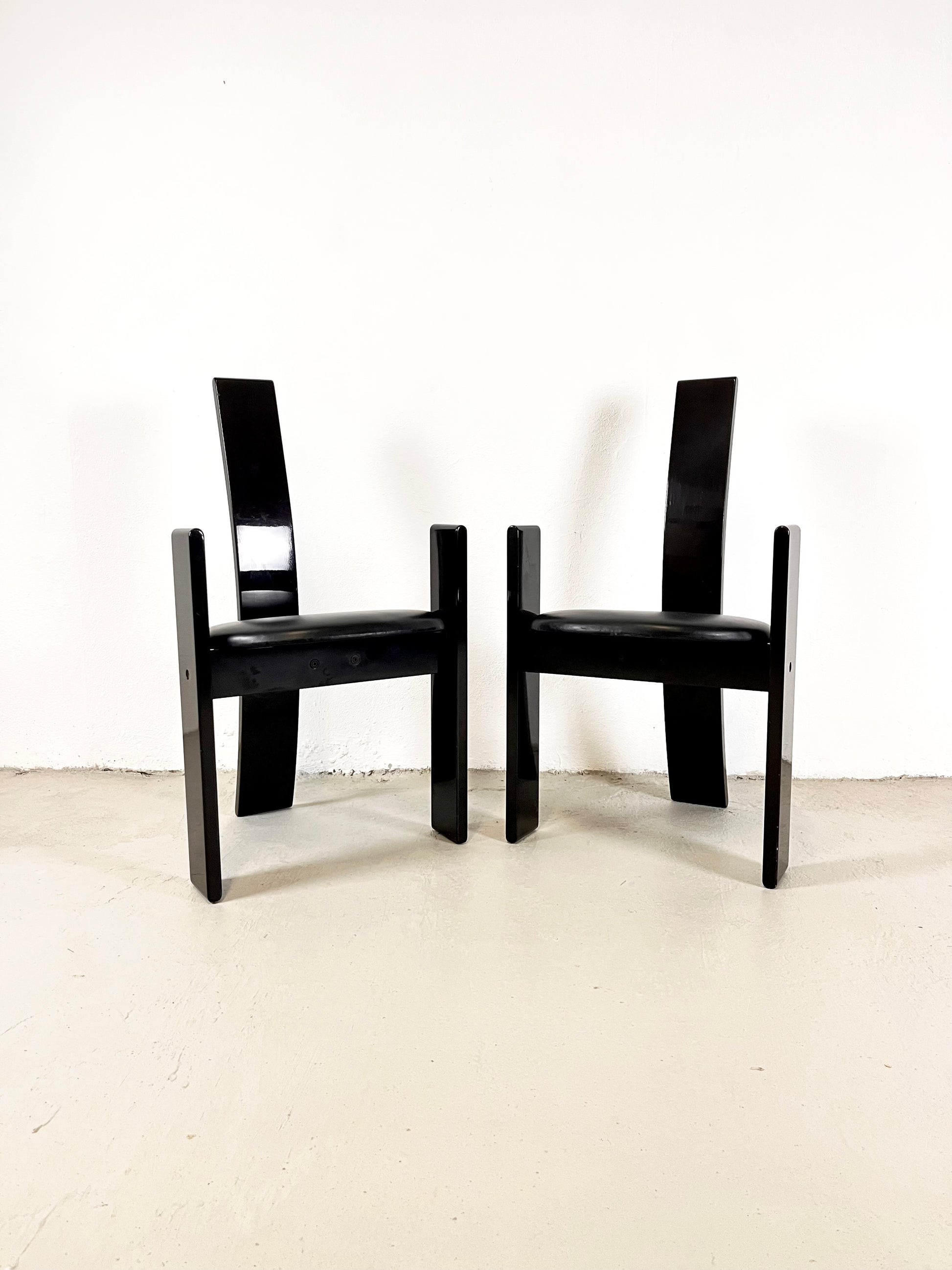 Elegante coppia di sedie modello Golem, disegnate da Vico Magistretti per Poggi negli anni '70. Realizzate in legno laccato nero lucido, presentano una struttura solida e minimal, caratterizzata da linee geometriche e da un profilo deciso. Il sedile in pelle nera e lo schienale leggermente inclinato garantiscono comfort e stabilità, mentre lo schienale basso dona al modello un aspetto compatto e contemporaneo, mantenendo comunque la tipica verticalità della serie Golem.