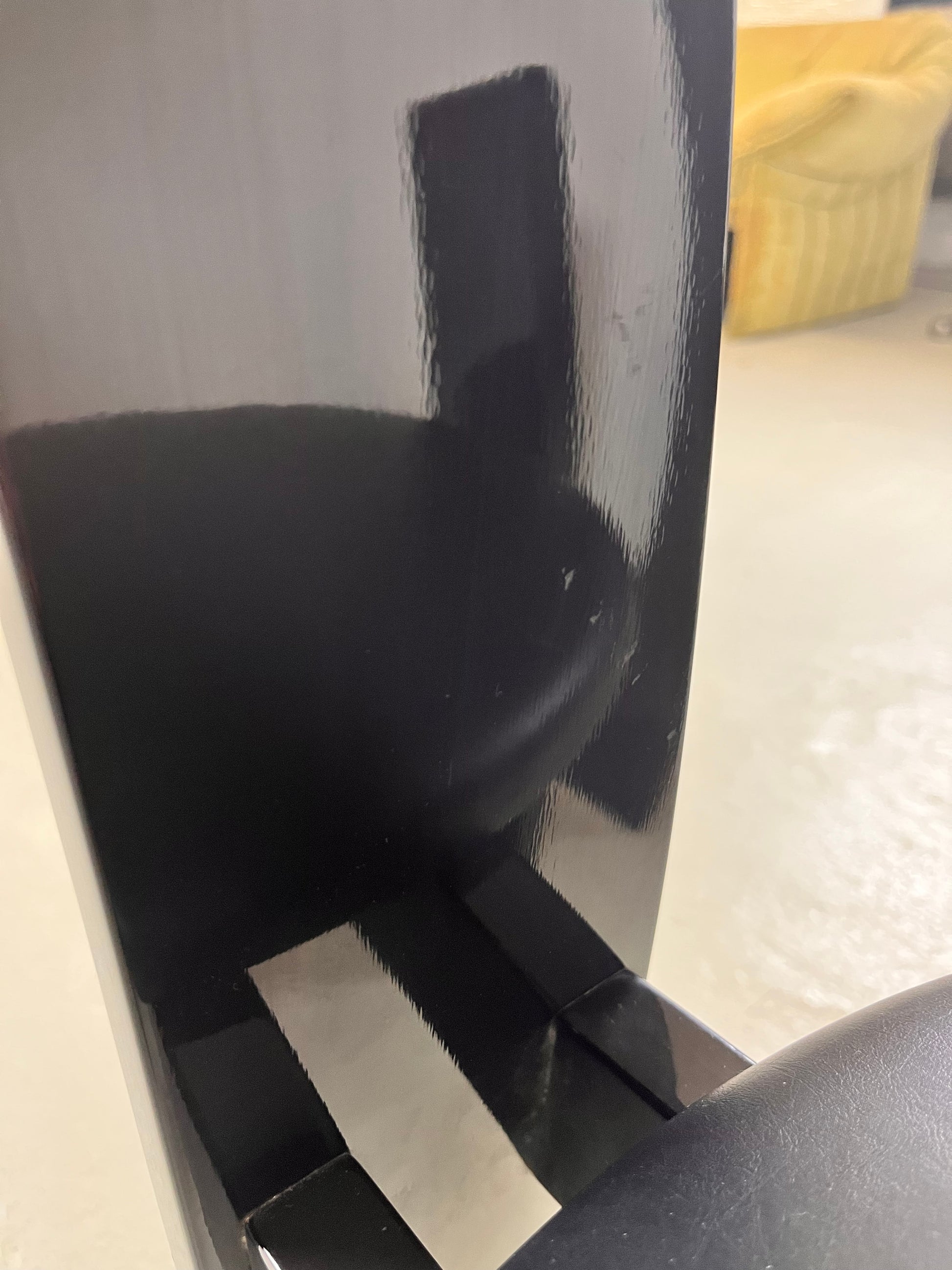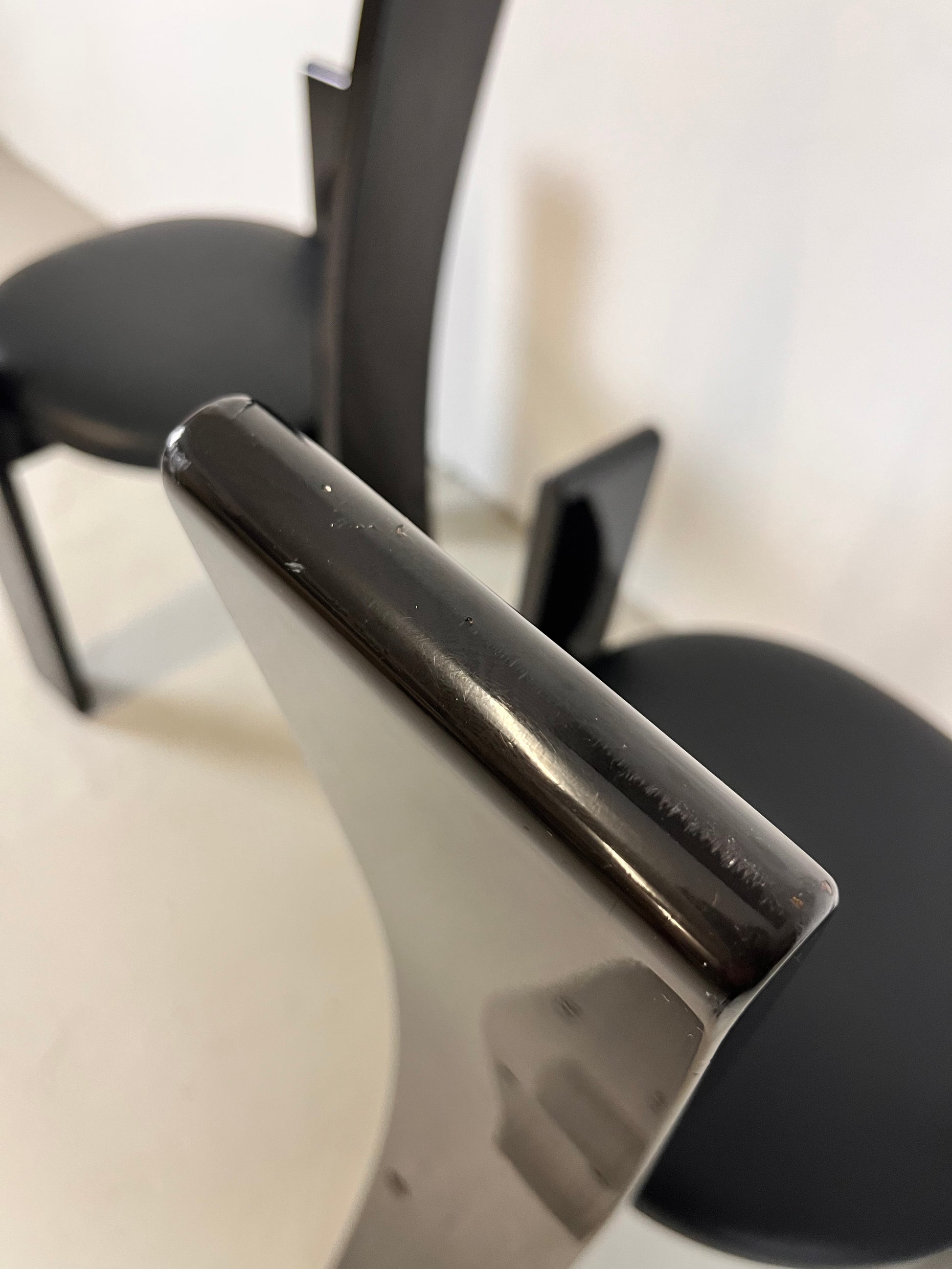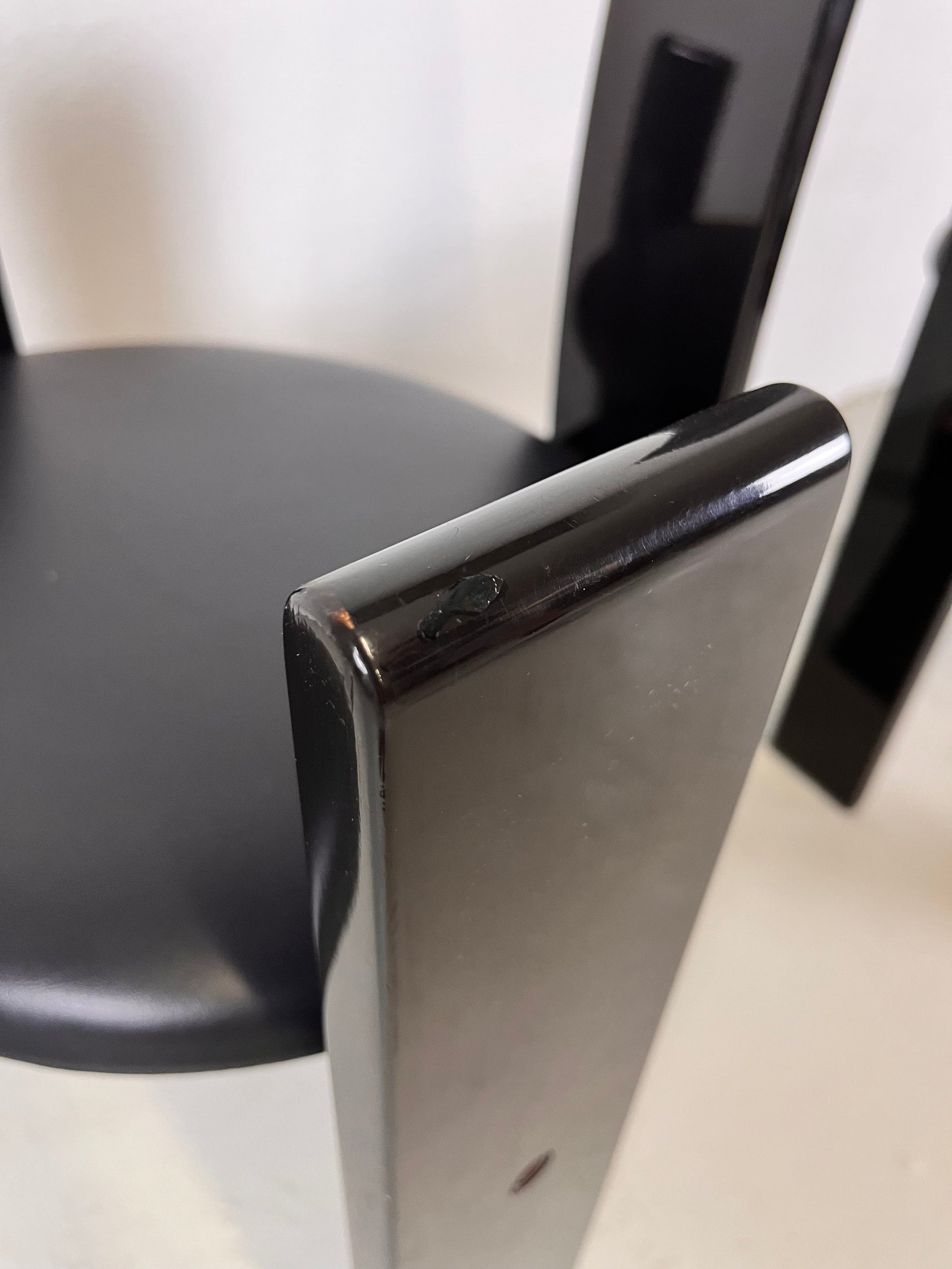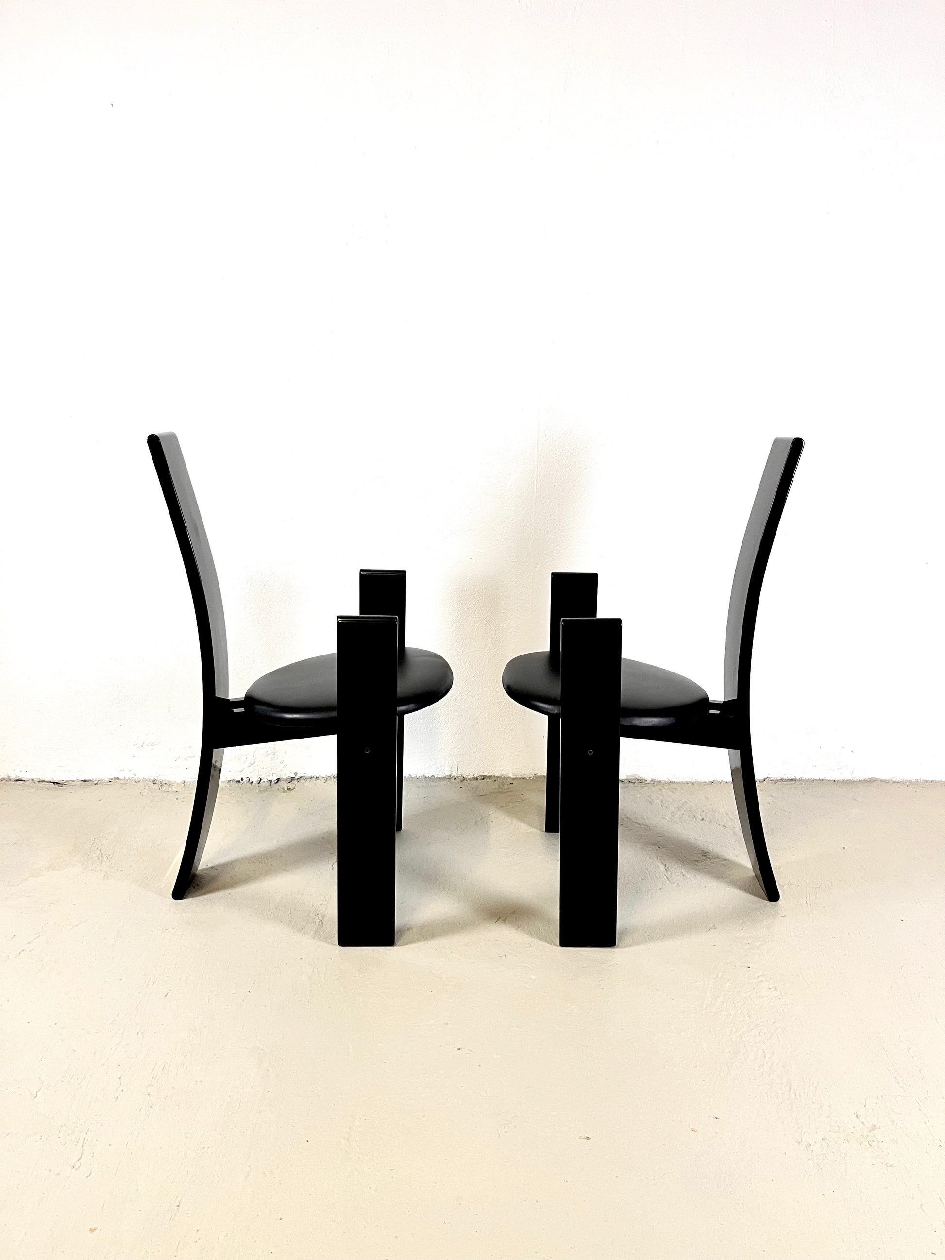 Elegante coppia di sedie modello Golem, disegnate da Vico Magistretti per Poggi negli anni '70. Realizzate in legno laccato nero lucido, presentano una struttura solida e minimal, caratterizzata da linee geometriche e da un profilo deciso. Il sedile in pelle nera e lo schienale leggermente inclinato garantiscono comfort e stabilità, mentre lo schienale basso dona al modello un aspetto compatto e contemporaneo, mantenendo comunque la tipica verticalità della serie Golem.