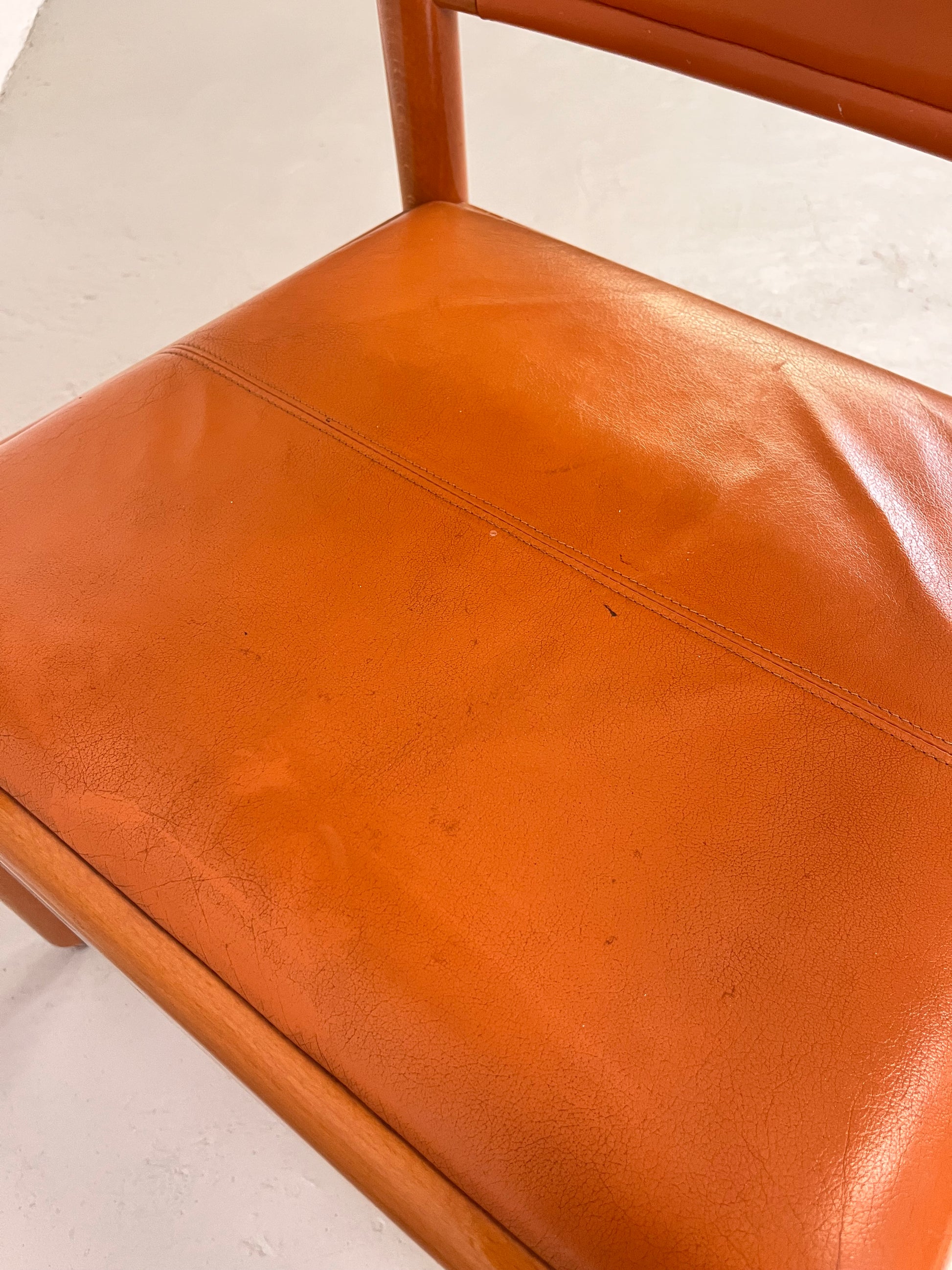 La seduta e lo schienale, rivestiti in cuoio color cognac, offrono un'eccellente comodità e una patina calda e uniforme che aggiunge carattere e autenticità. I braccioli sagomati conferiscono un ulteriore tocco di eleganza e funzionalità, rendendo queste sedie ideali sia per un tavolo da pranzo che come sedute da studio o ufficio.