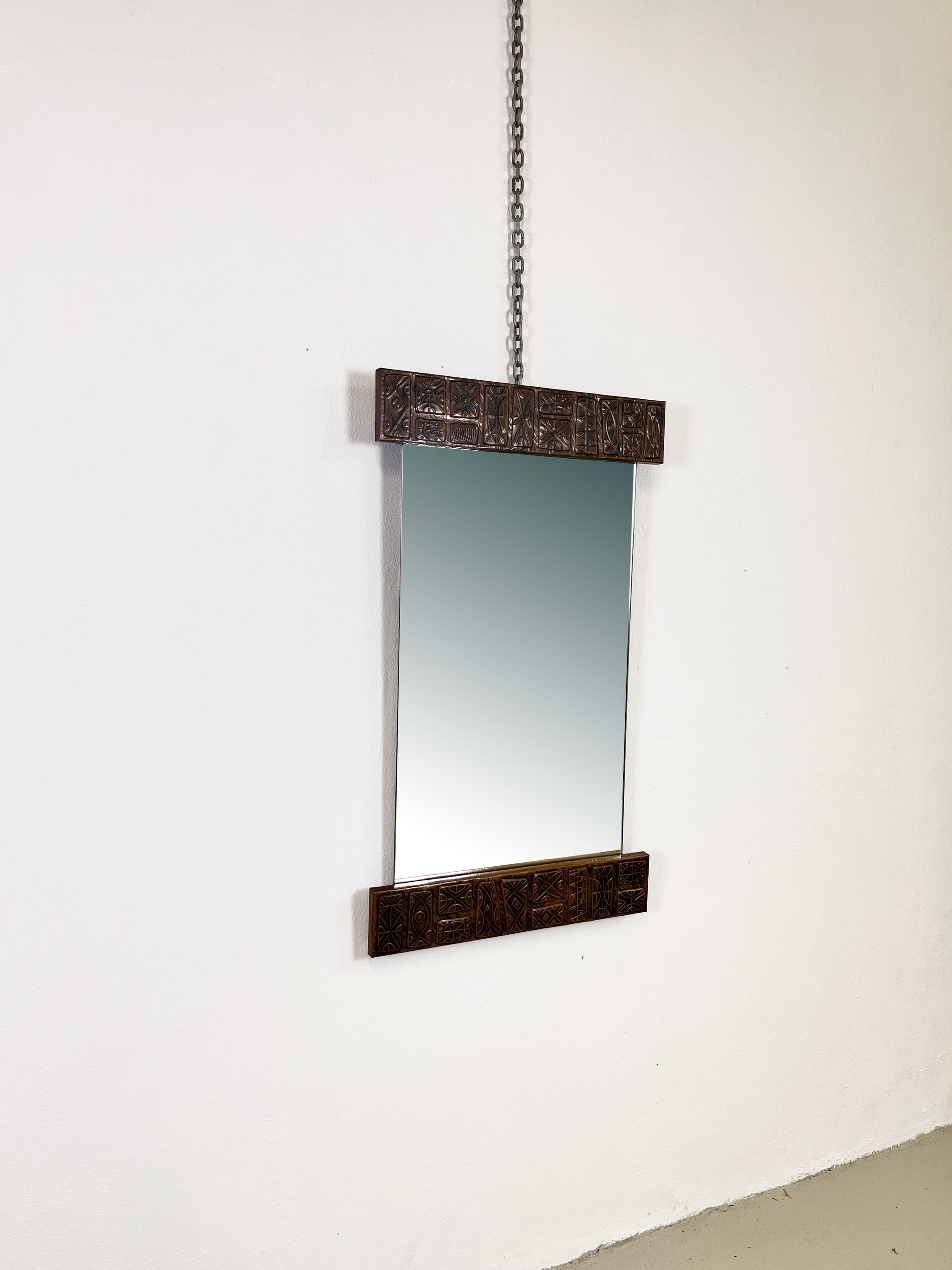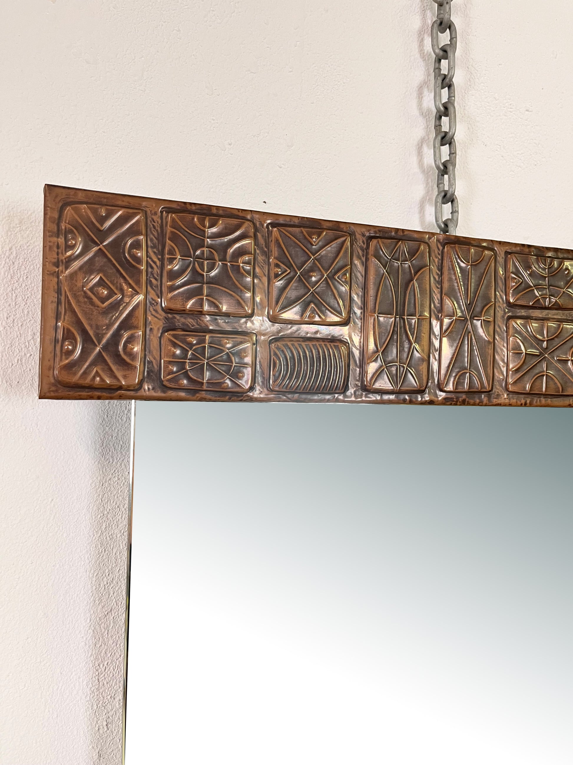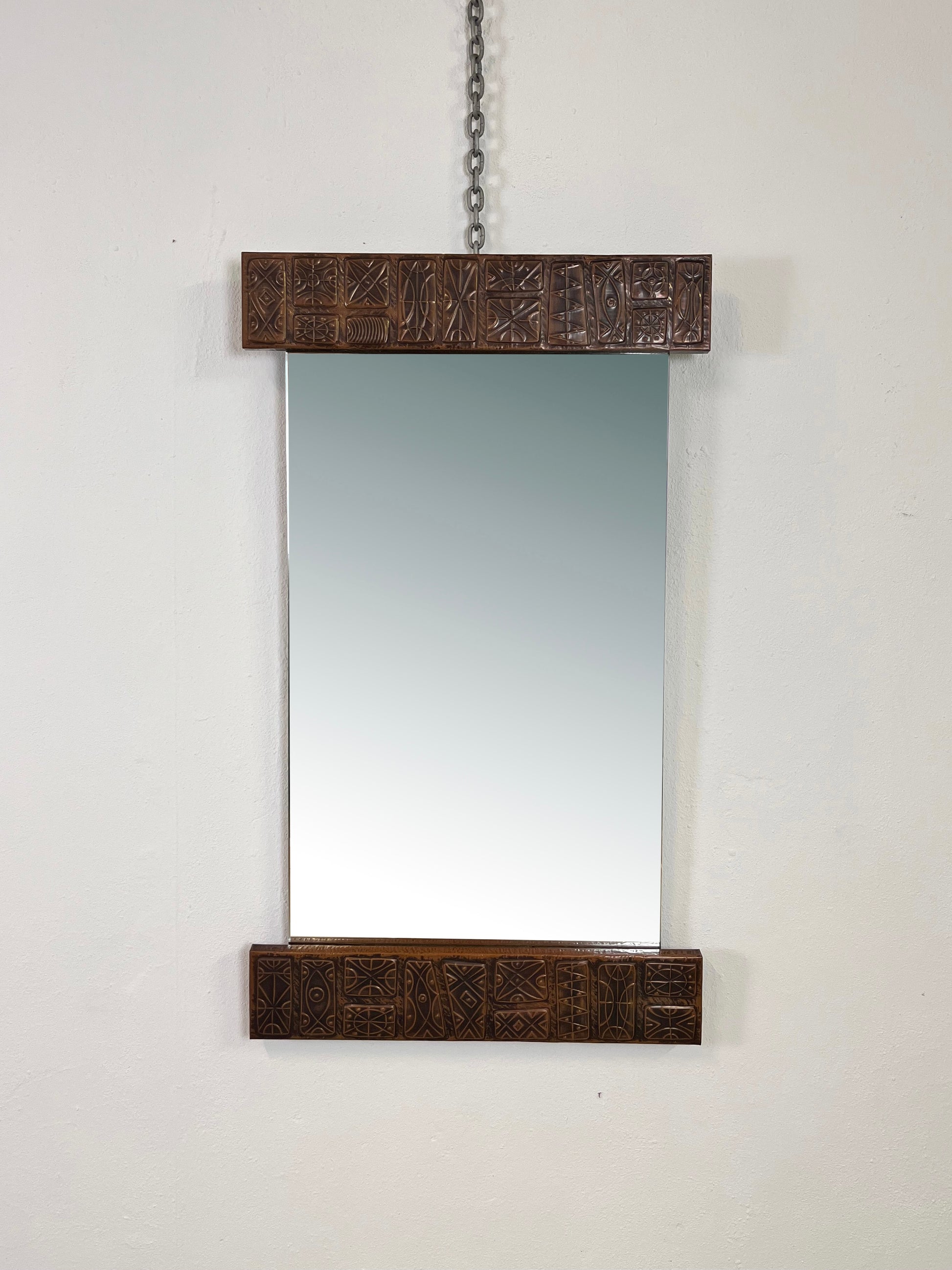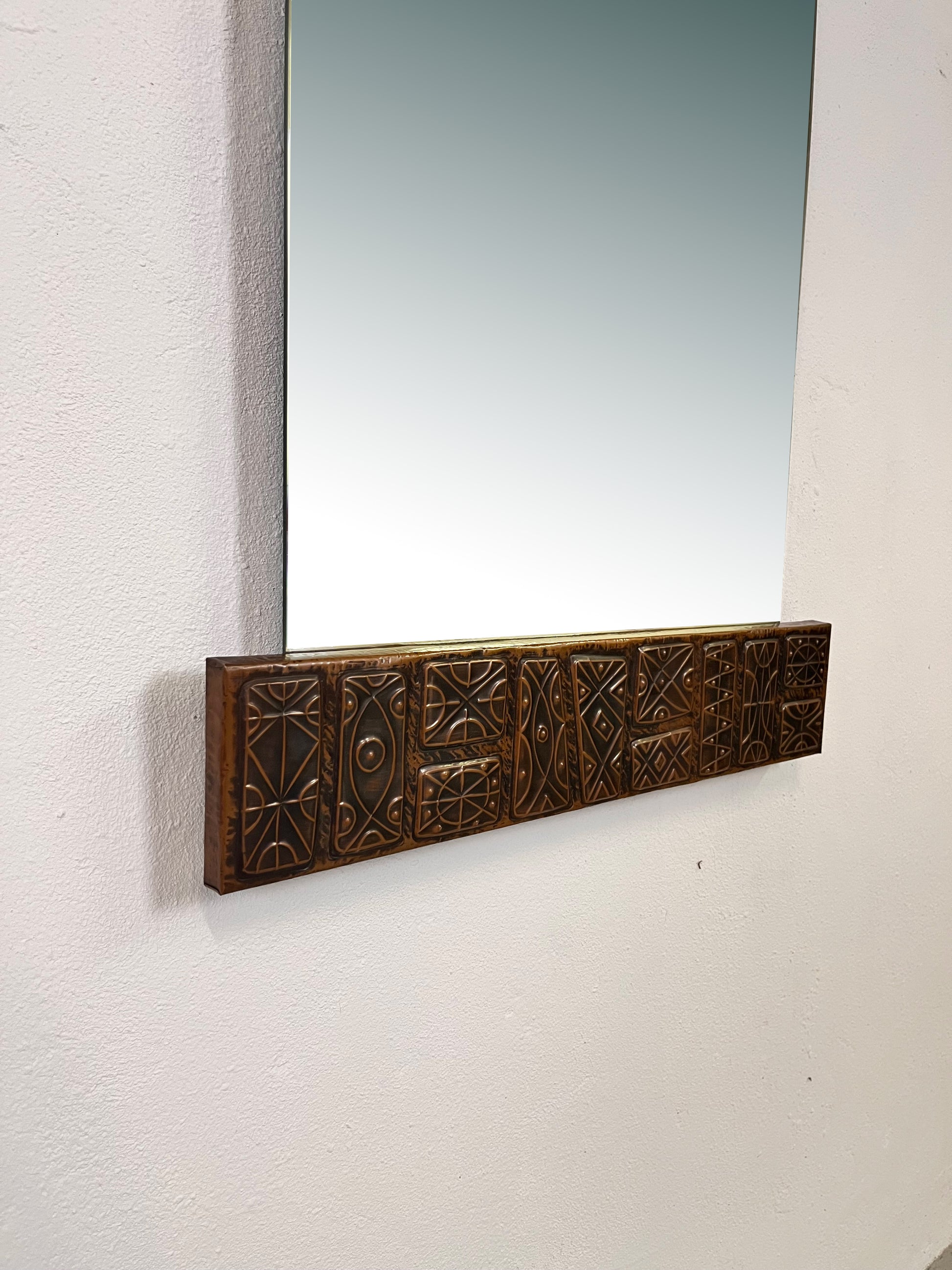 Un oggetto unico nel suo genere, lo specchio di Santambrogio & De Berti si distingue per il suo raffinato equilibrio tra funzionalità e decorazione artistica. Le decorazioni in rame sbalzato sulla cornice superiore e inferiore conferiscono allo specchio un carattere scultoreo e senza tempo.